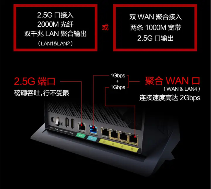 这里再推荐一款使用ROG商标的ROG GT-AX6000,它采用的是RT-AX86U Pro同款的博通BCM4912 CPU,性能十分强劲,同时搭配了两个2.5G网口,还支持WAN口聚合与LAN口聚合,因此可玩性甚至比RT-AX86U Pro更强。