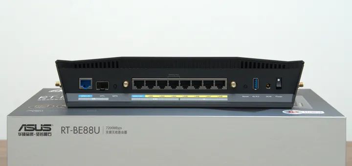 ▲华硕RT-BE88U的接口可以说是十分齐全,9个电口一个光口,最多可以同时有线连接10台设备,它应该是华硕路由器中,有线网口最多的一款。相对上一代华硕RT-AX88U(8个千兆网口)与RT-AX88U Pro(2.5G WAN+2.5G LAN+4个千兆LAN),在网口的数量与质量上都有明显提升。