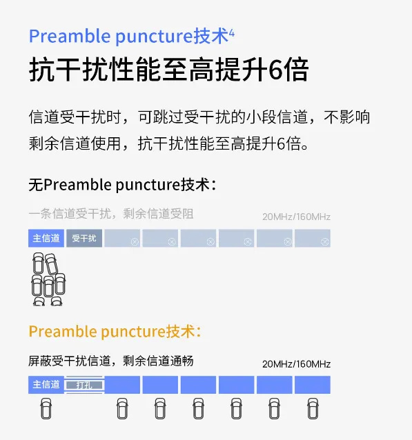 而Wi-Fi 7的前导码打孔技术(Preamble Puncture)则可以在某条20MHz辅信道干扰强烈的时候,跳过此信道,将其余多信道捆绑在一起,进而大幅提升了Wi-Fi 7无线信号的抗干扰能力,在干扰强烈的使用环境下,仍能保持较高的传输速度。