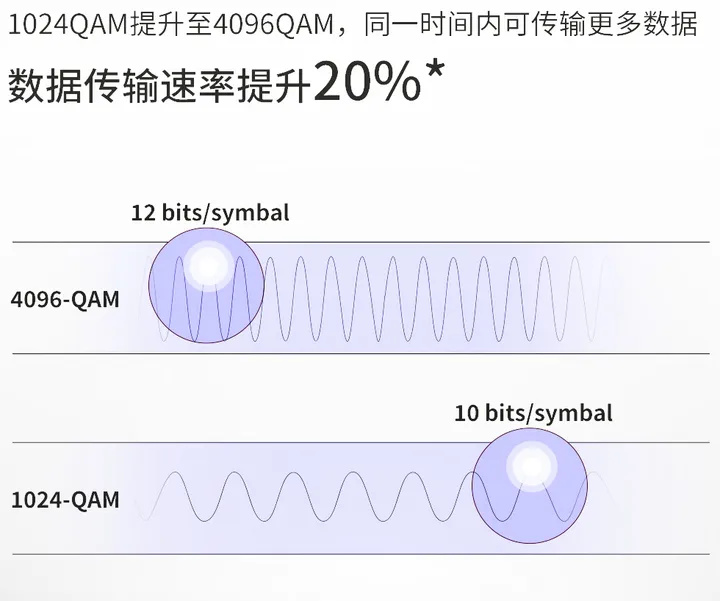 ▲QAM是Quadrature Amplitude Modulation(正交振幅调制)的缩写,WiFi 7的QAM由WiFi 6E的单次10bit升级到单次12bit,因此,数据传输速率提升了20%。