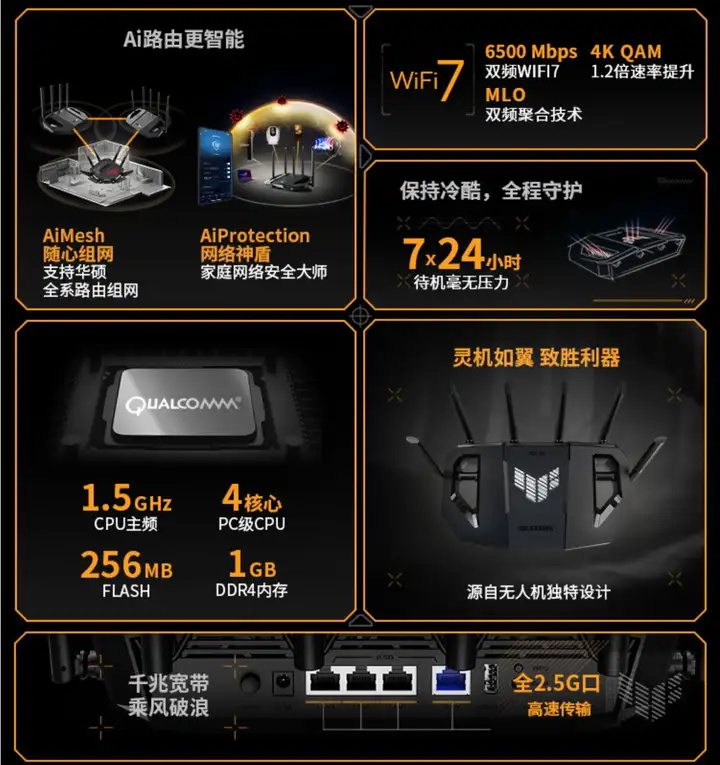 首先推荐一款目前华硕最便宜的WiFi 7路由器,TUF GAMING 小旋风 WiFi7 BE3600,TUF电竞特工是华硕旗下的电竞子品牌,相较主打最强性能与个性的ROG,TUF更注重性价比,这款TUF GAMING小旋风配备了博通4核 2GHz处理器与1GB的大内存,相较于上代小旋风,硬件上提升明显。网口方面这提供了1个2.5G的WAN/Lan自定义口与4个千兆网口,同时支持两个千兆LAN口链路聚合。