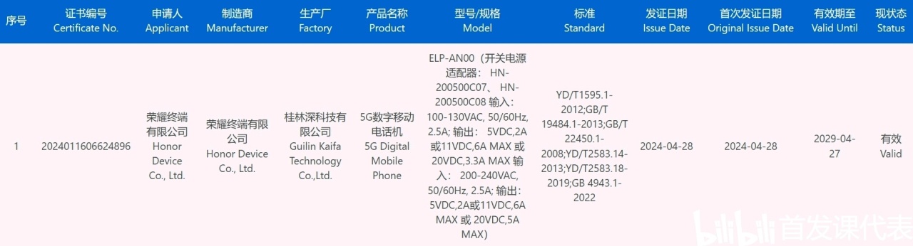 ——認證信息顯示,這款新機申請人爲榮耀終端有限公司,生產廠爲桂林深科技有限公司,配備 100W 充電器。
