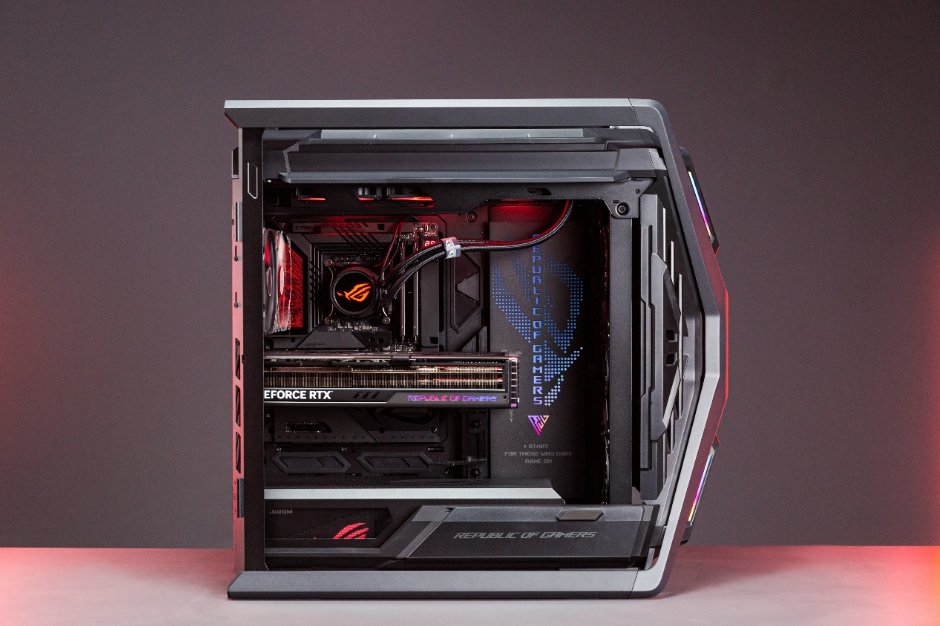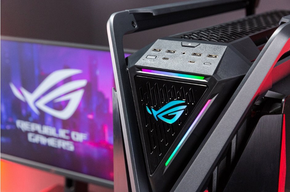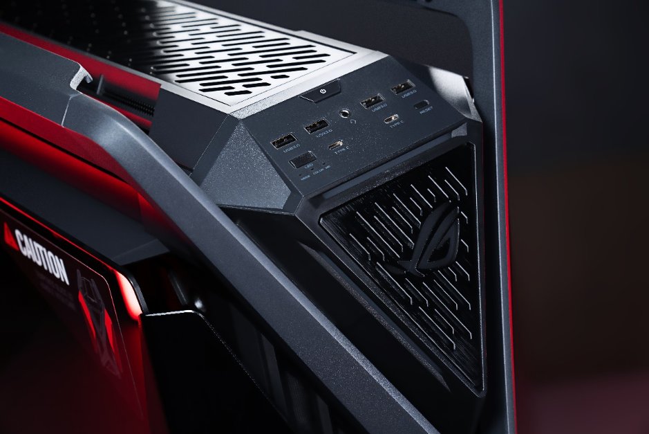 X型金屬框架的上下兩個三角區域都設計了燈光,開機亮起後,顯得頗爲炫酷,上方的ROG“敗家之眼”更是信仰十足。頂部設計了豐富的I/O面板,擁有4個USB 3.2 Gen 1 Type-A、2個USB 3.2 Gen 2×2 Type-C和1個二合一3.5mm音頻接口。按鍵則是提供了開機鍵、重啓鍵和燈光控制鍵。
