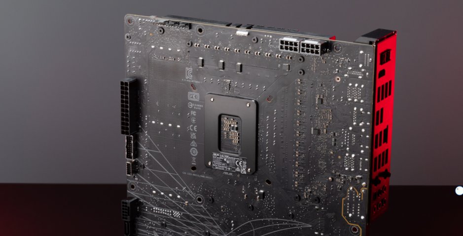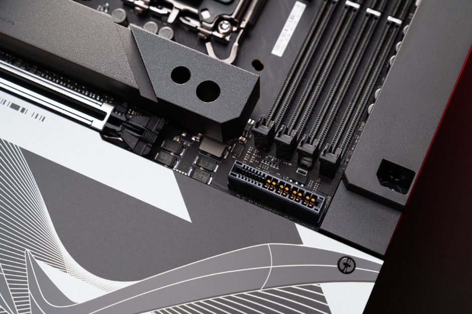 我們也可以看到,爲了給顯卡供電,所以在ROG MAXIMUS Z790 HERO BTF主板的背面還設計了一個最新的12V-2×6 16Pin顯卡供電接口。玩家只需要將電源的16Pin顯卡供電接口插在這裏就可以爲正面的顯卡供電。