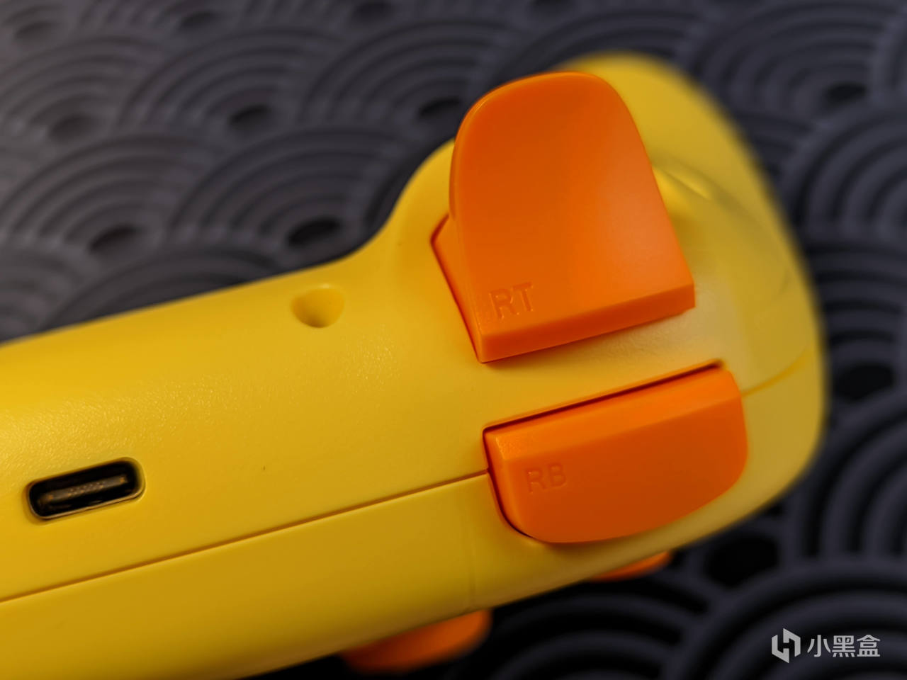 视角拉到上面~虽然早就有心理准备了,但和标准版一样没有手机支架孔还是让人不免有些遗憾的,上方比较简约,只有一对肩键,一对扳机键和一个C口的充电口,充电口并没有做加深设计,所以基本什么数据线都可以使用,这点好评,肩键与扳机键同样有做一些优化,例如肩键按压起来空腔音少了很多,显得更加敦实了,扳机键则是更加顺滑,感觉线程表现更加优秀,而不是初代起步会卡顿一下,不过遗憾的是依然没有加入霍尔线性扳机,所以采用的还是普通的线性扳机,不过这点应该是和价格有关的。