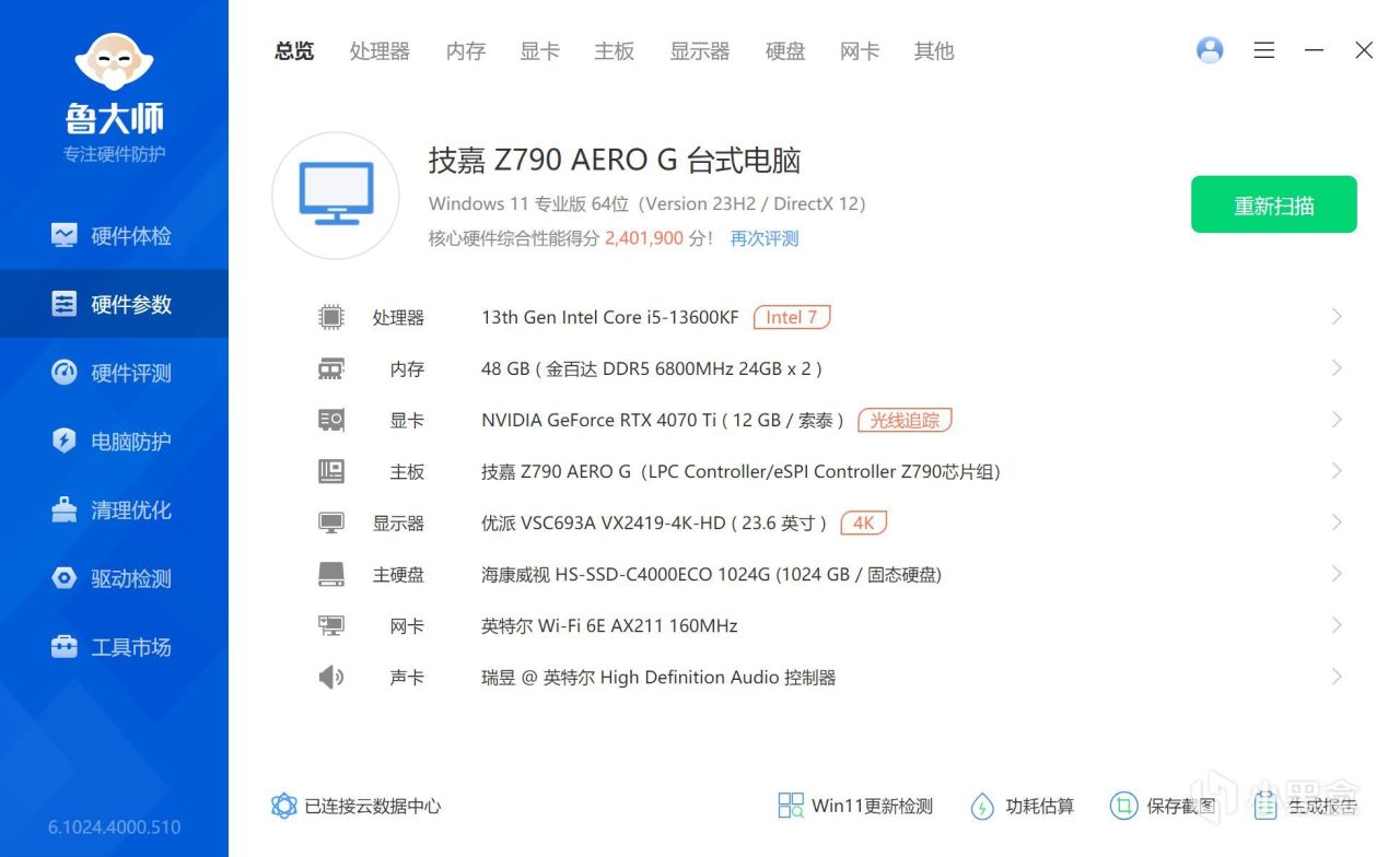 ▲ 鲁大师整套硬件配置跑下来,综合性能得分240万分,也算是平衡了性能和价格的一套高性价比配置,绝对是能妥妥的畅快爽玩3A大作。