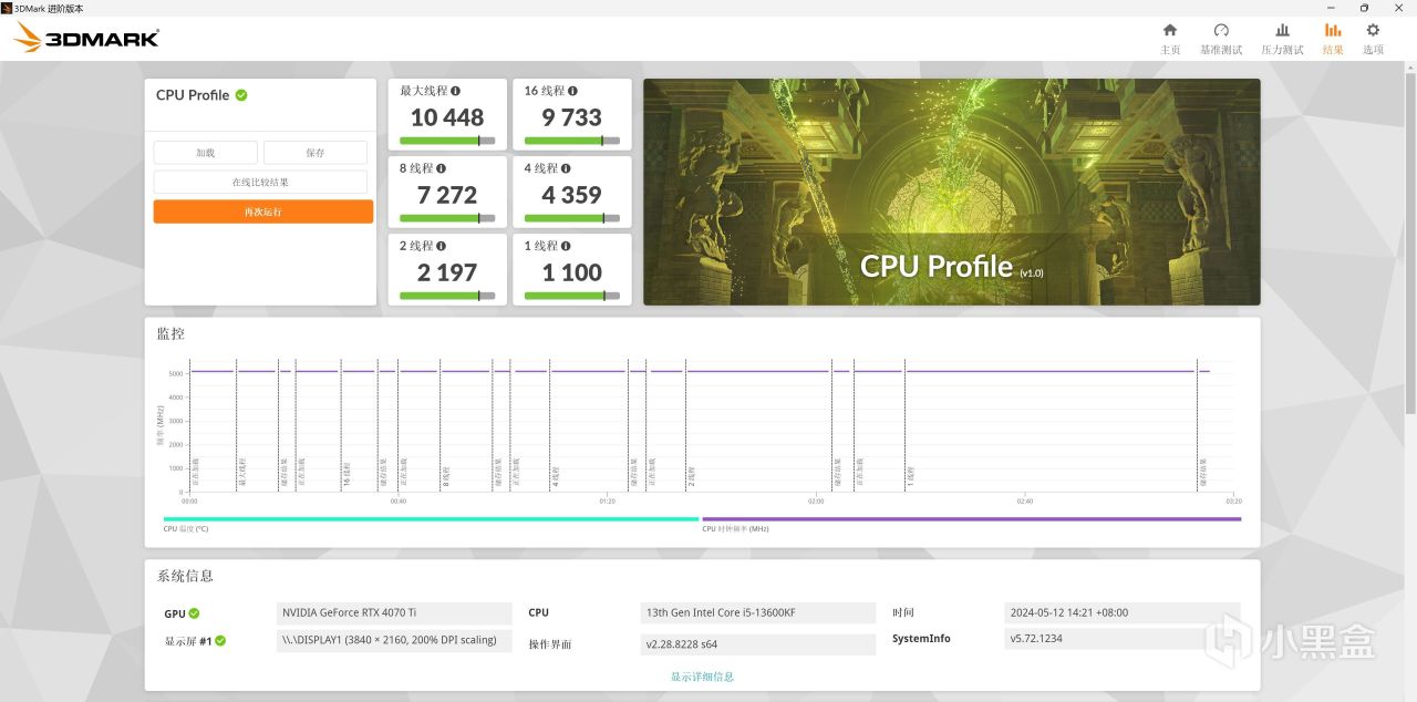 ▲ 使用3D MARK中的CPU Profile项目对CPU进行基础测试,最大线程分数10448,单线程分数1100。