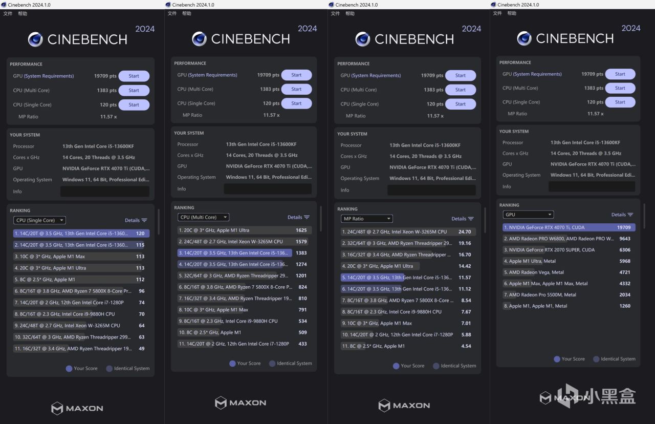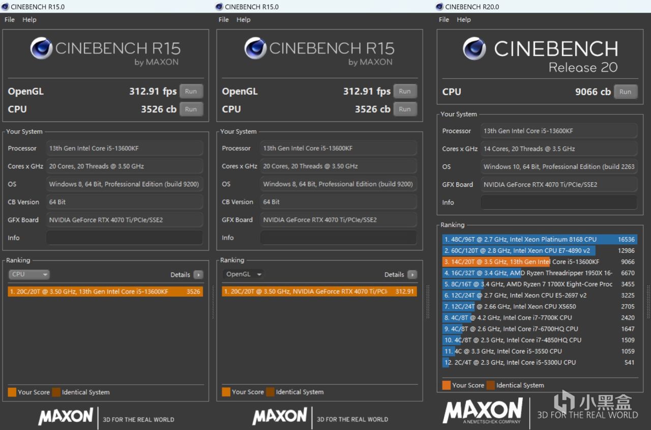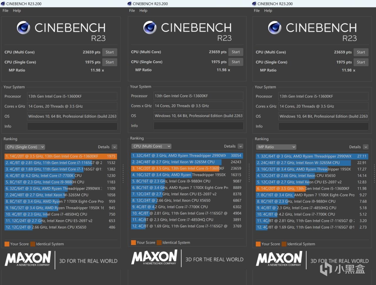 ▲ Cinebench R15、R20、R23、2024是一款基于Cinema 4D引擎的跨平台测试软件,能够充分测试处理器的渲染性能,通过以上软件对处理器的单核和多核性能进行测试。在测试中,酷睿i5-13600KF处理器的单核性能表现非常出色,多核性能表现也十分优异,将14核心20线程的性能表现的淋漓尽致。