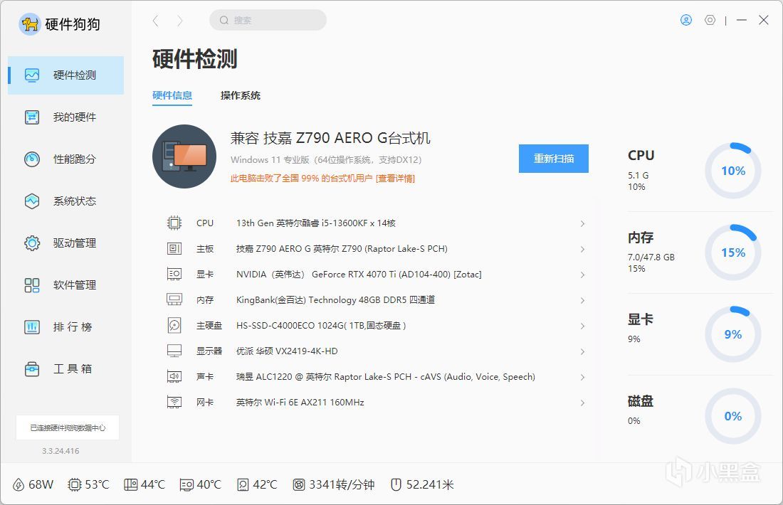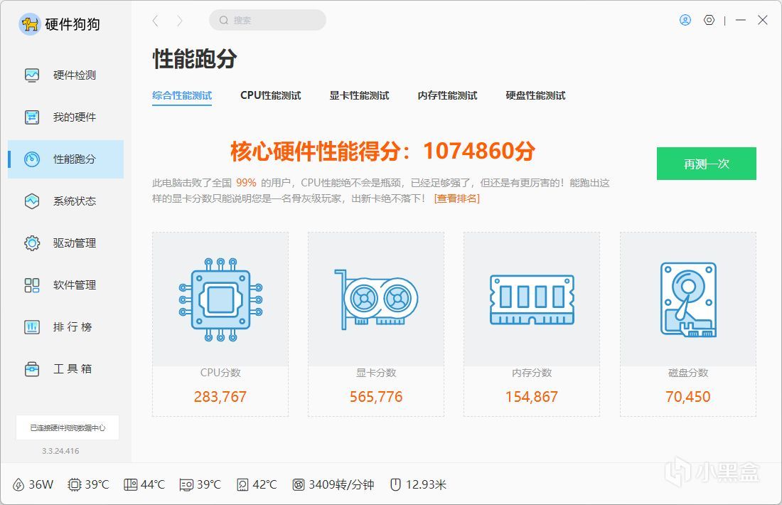 ▲ 硬件狗狗也是在整套硬件配置跑下来,核心硬件性能得分:107.4万分,击败了全国99%的用户,可以说是一名骨灰级玩家了。