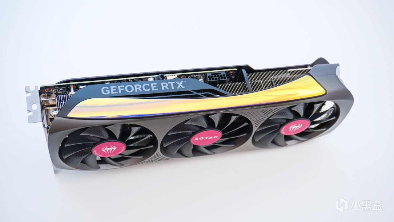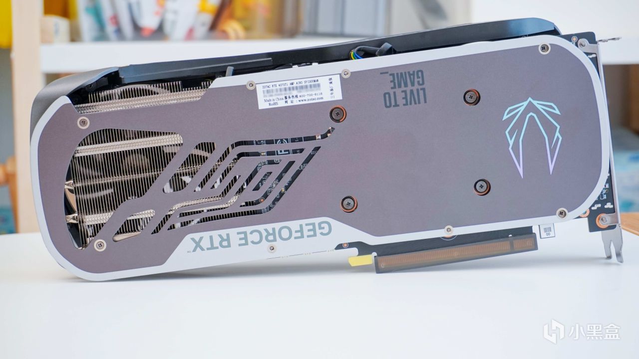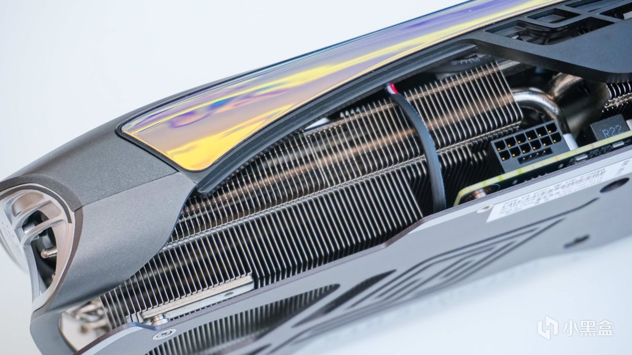 ▲ 显卡背面采用了黑色的金属背板,左侧区域是有小面积的镂空开孔,圆润的造型还是别树一格,可以安装官方配件“蜘蛛侠联名款”的磁吸背板,当然这对于机箱内部来说会占用一定高度。