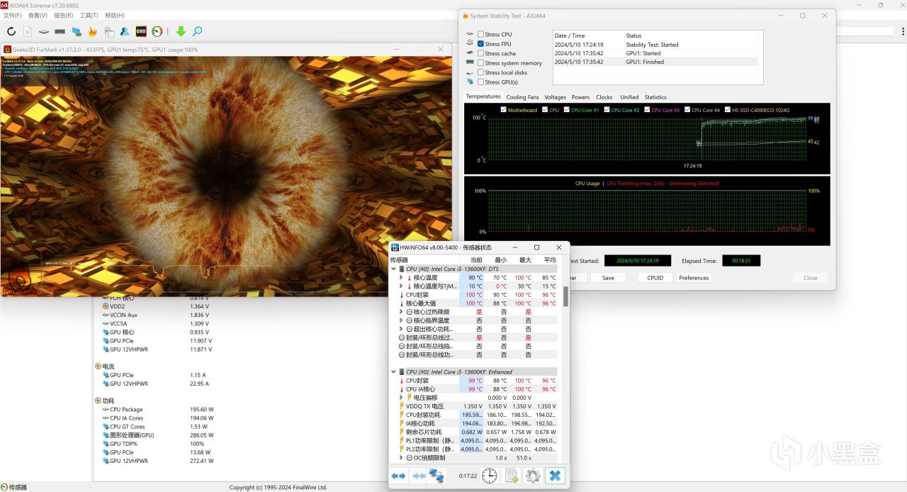 ▲ 别看酷睿酷睿i5-13600KF处理器看似风冷都能压制,上水冷肯定是没啥压力的?那就大错特错了,一旦开启AIDA64的FPU压力测试和“甜甜圈”进行双烤机,那CPU温度可以轻松突破100℃,CPU的功耗来到200瓦,GPU的功耗来到了286瓦。当然正常人不会这么极端使用,所以也足以证明九州风神冰暴MYSTIQUE 360这套一体式360水冷散热系统还是推荐给带K、KF处理器搭配使用的。