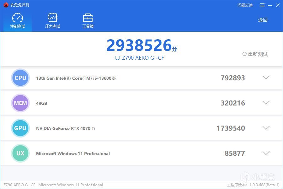 ▲ 用安兔兔PC评测进行测试,总体性能得分成绩为293万分,这应该算是四海哥我测试过的最高得分记录了。