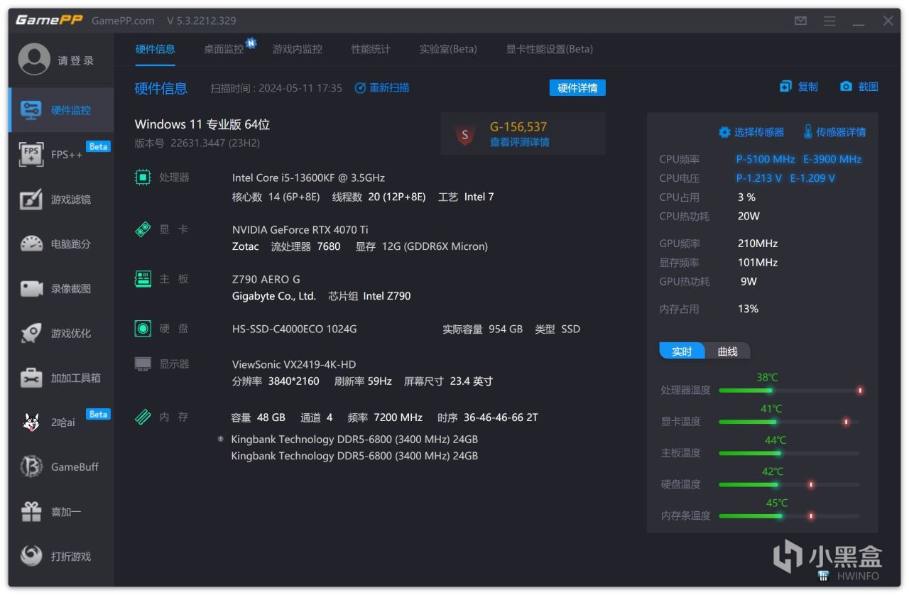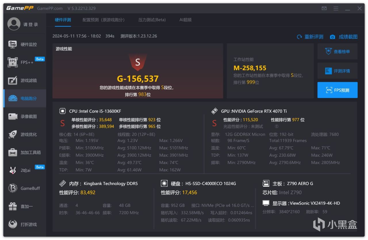 ▲ 用GamePP(游戏加加)进行测试,游戏性能得分成绩为G-156537,工作站性能得分成绩为M-258155,处于本赛季S段位,排行第983位的名次。