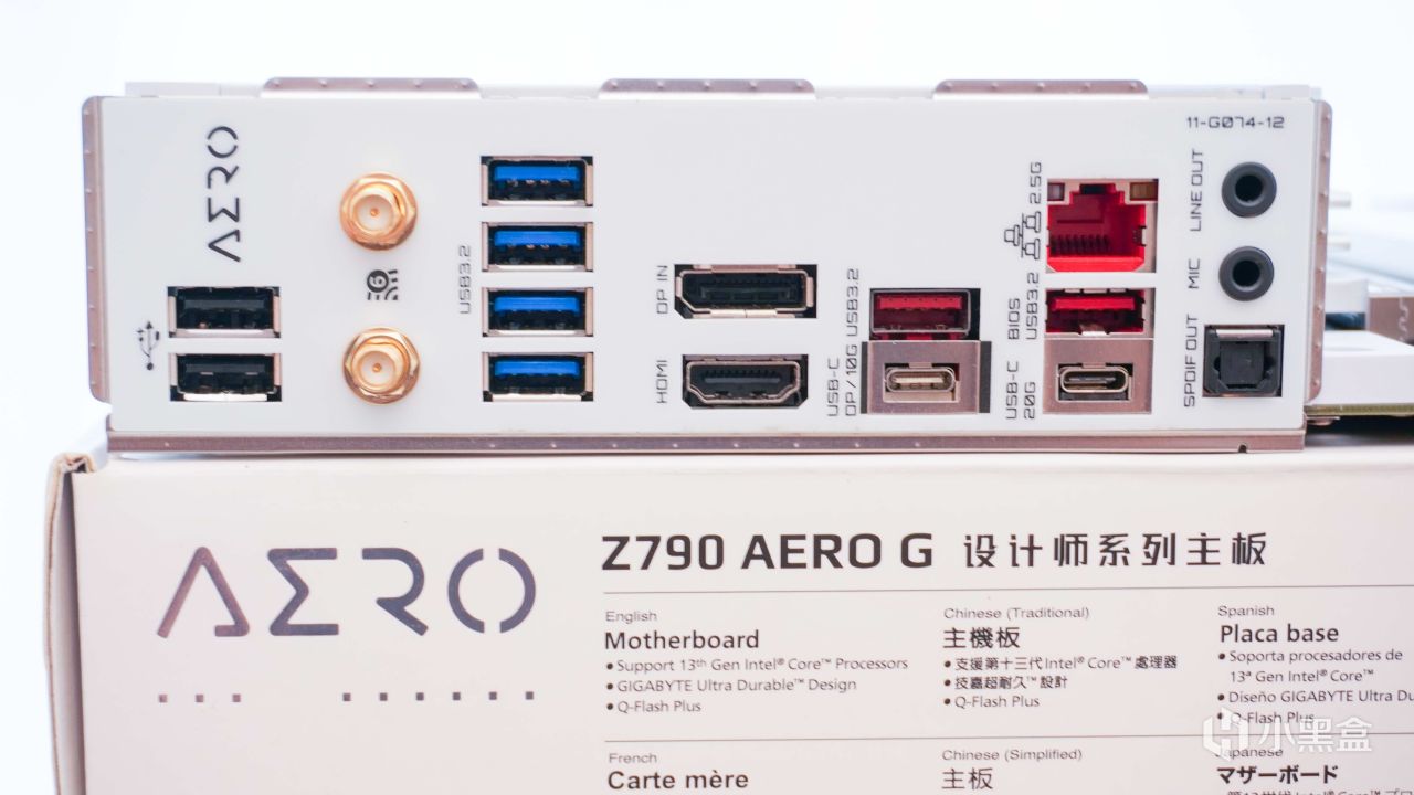 ▲ 在技嘉Z790 AERO G主板上接口给的是非常的齐全,提供了2个USB 2.0接口、WiFi 6E(Intel AX211NGW)天线接口、4个USB 3.2 Gen2 Type-A、1个 HDMI接口、1个 DP接口、2个USB 3.2 Gen1 Type-A接口、1个USB 3.2 Gen2 Type-C接口、1个USB 3.2 Gen2x2 Type-C接口以及1个2.5 G网络接口和1个SPDIF OUT复合音频接口,一个3.5mm MIC、LINE OUT音频接口。