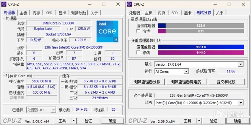 ▲ 使用CPU-Z对处理器性能进行测试跑分,最终得出单核成绩为828.6,多核成绩为9831.0,在单核性能上与酷睿i9-12900K处理器处理器相差无几,在多核性能上也与酷睿i9-12900K处理器处理器接近。