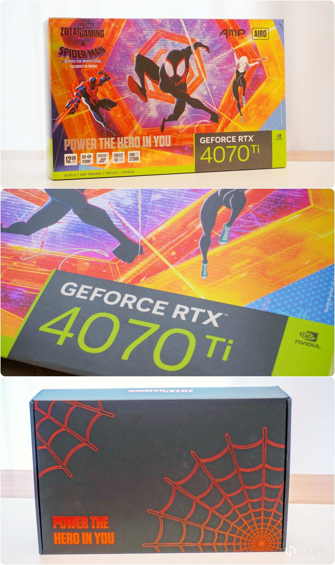 ▲ 索泰RTX 4070 Ti AMP AIRO SPIDERMAN蜘蛛侠联名显卡的包装突显了蜘蛛侠的包装元素。