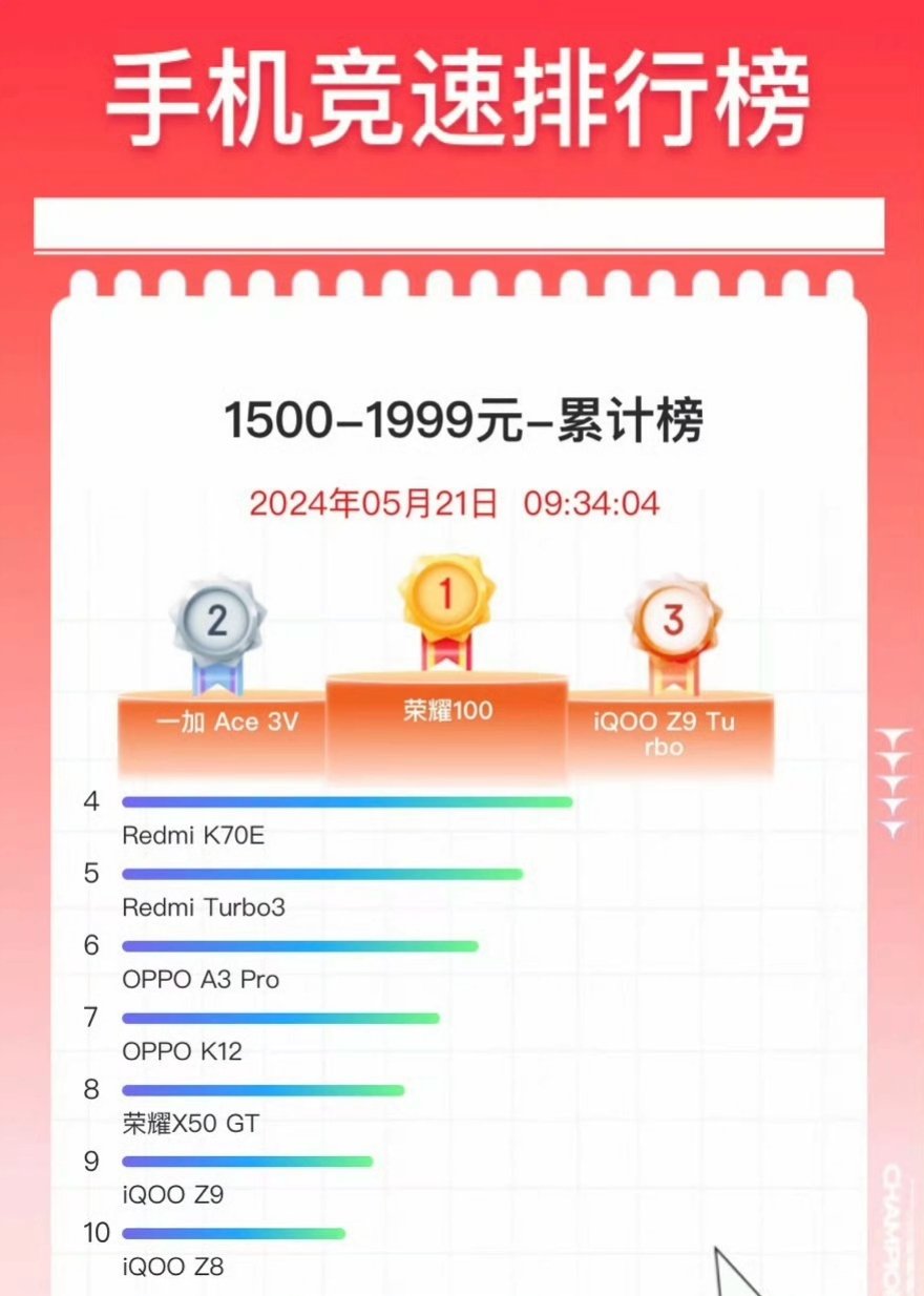 荣耀100第一,一加ACE 3V第二,iQOO Z9 Turbo第三,荣耀这是闷声发大财,不靠配置照样可以俘获消费者的心!