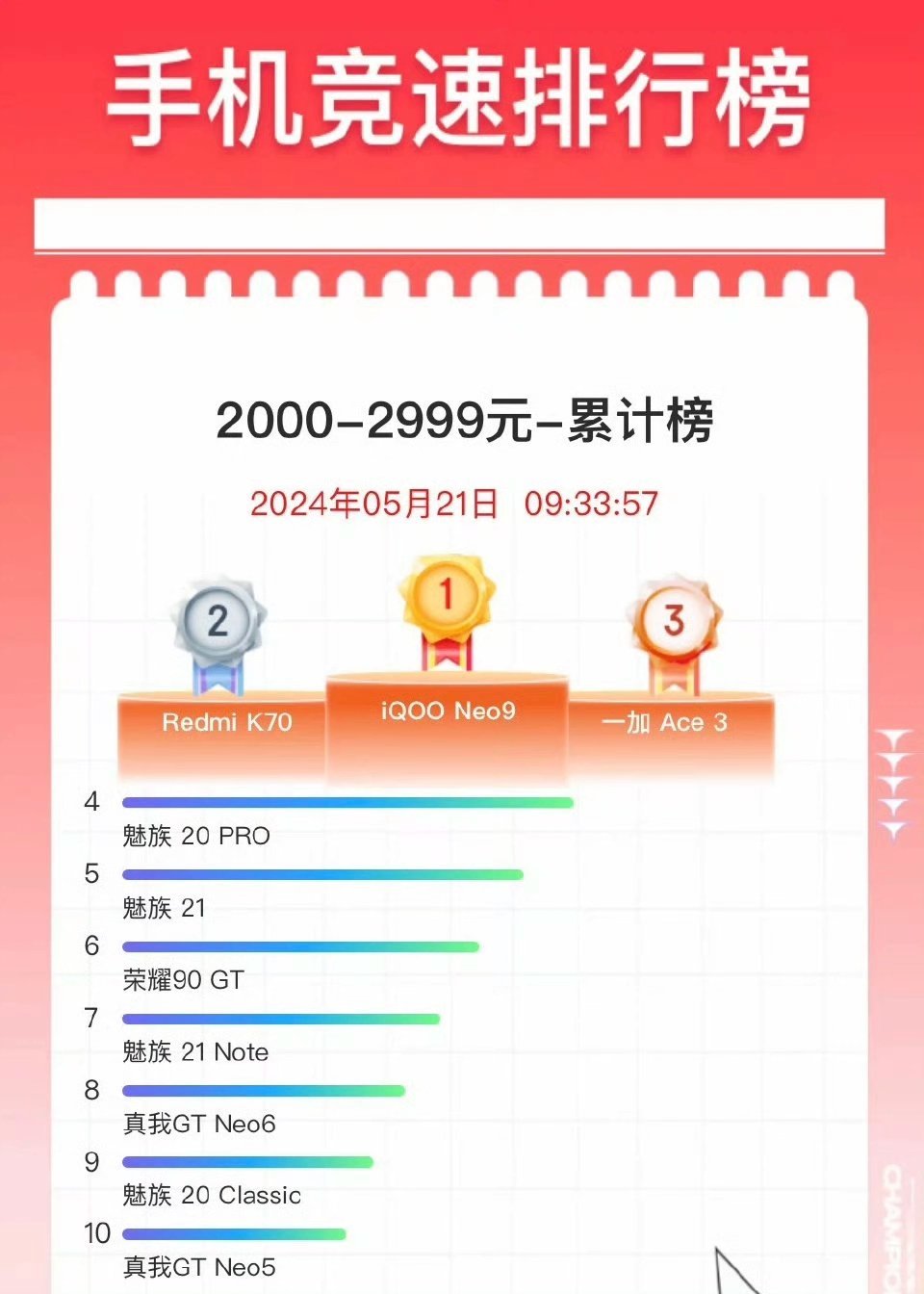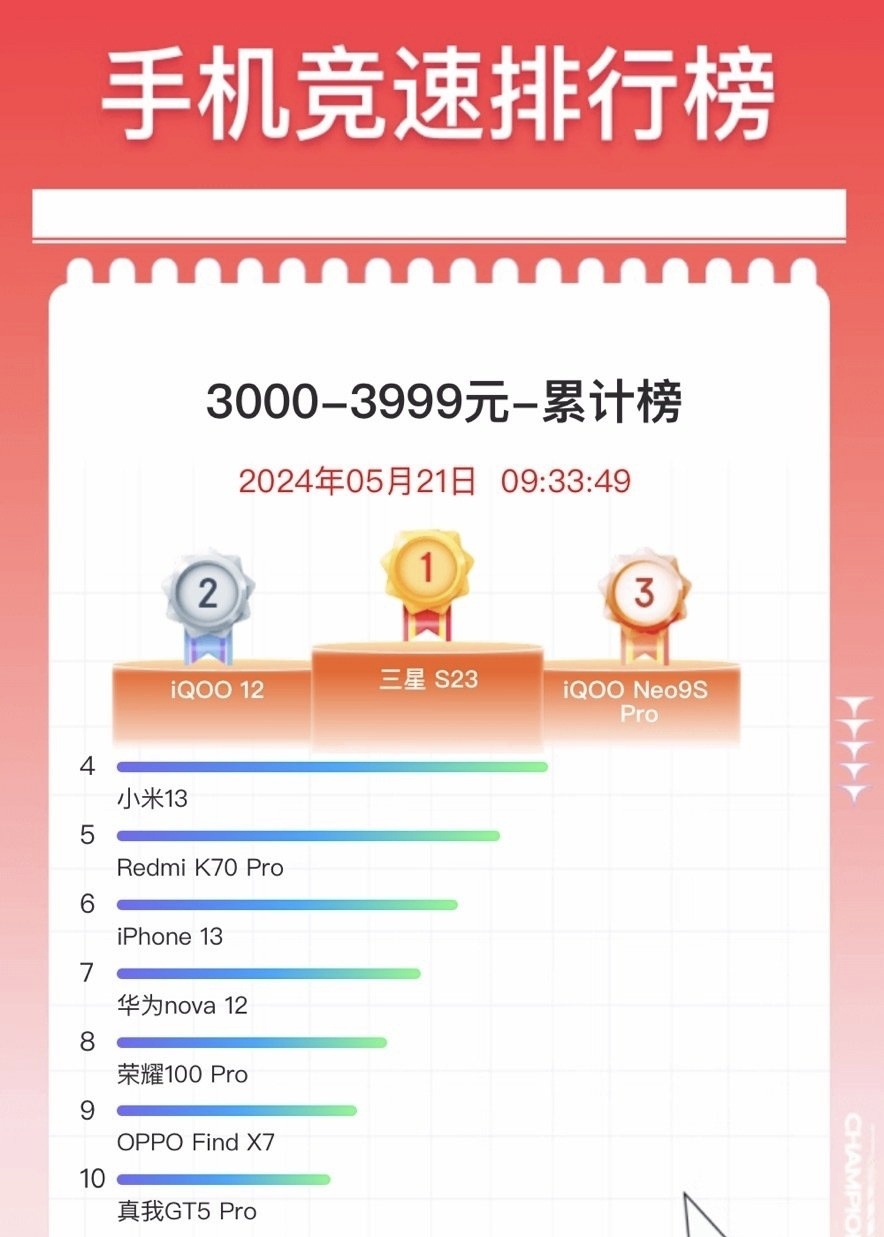 三星S23第一,iQOO 12第二,iQOO Neo9S Pro第三,iQOO Neo9S Pro新机上市加量还减价,表现强劲。