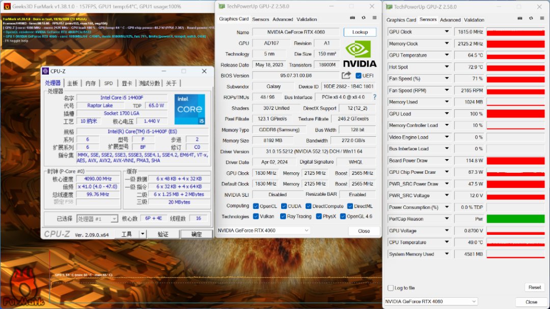 FurMark 烤机测试,机箱内环境,烤机15Min,显卡温度为65°左右,显卡功耗为115W左右;