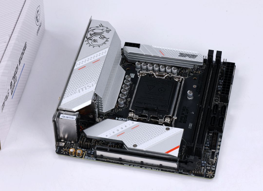 小机箱主板方面选择其实并不多,但长远考虑,当然还是首选D5版本的ITX主板。本次装机选择的依旧是熟悉的微星MPG B760I EDGE WIFI主板。8+1+1相智能供电设计,搭配上外接8Pin供电,可以轻松发挥14400F全部性能(配12600KF使用也完全没问题)。板载2个M.2固态插槽,均支持pcie4.0,共用一个冰霜散热铠甲。内存方面,也能支持D5 7200MHz+ OC。