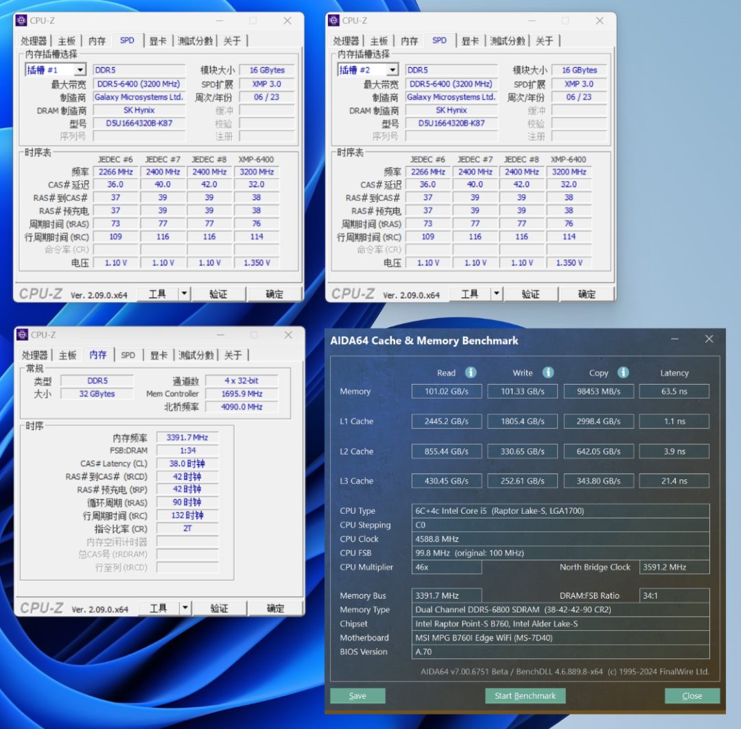 内存读写测试,直接将内存OC至6800MHz C38,并开启微星Memory Boost。内存读取速度为101.02 GB/s,写入速度为101.33 GB/s,复制速度为98453 MB/s,延时为63.5 ns;