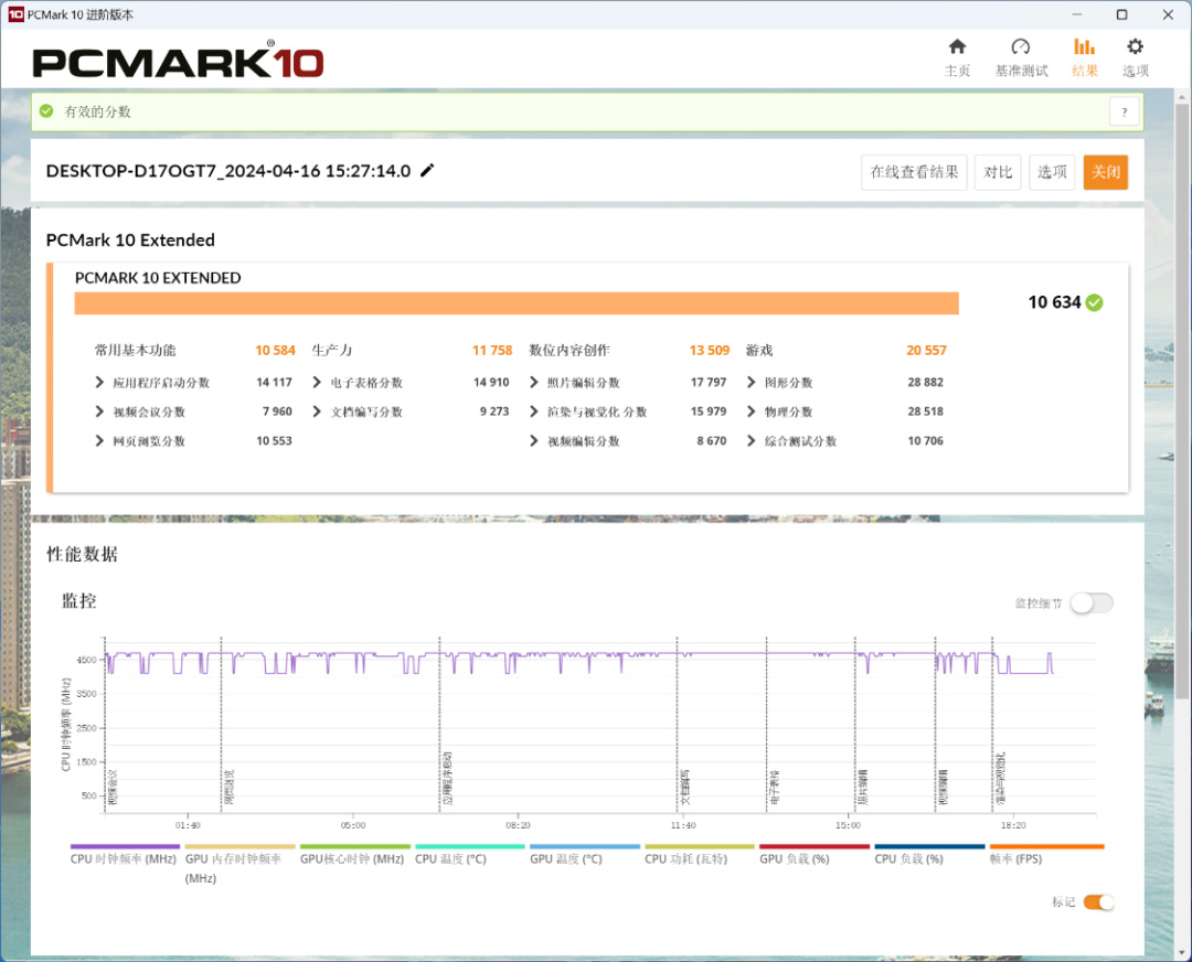 PC Mark Extended整机测试,整机得分10634分,常用基本功能得分10584分,生产力得分11758分,数为内容创作得分13509分,游戏得分20557分;