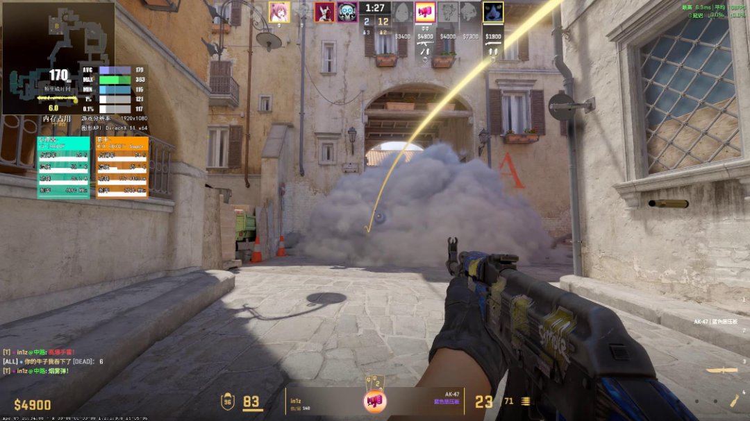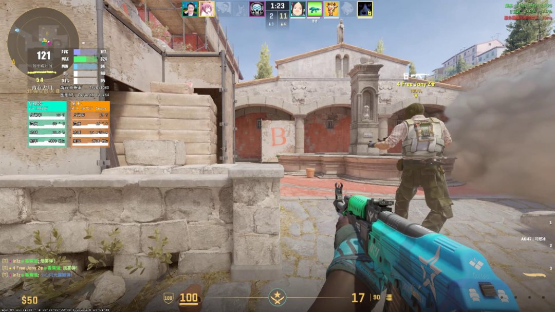 《CS2》游戏中,画质为非常高预设,使用B站玩家自制的测试Demo,1080P分辨率下,游戏实际帧率为120 FPS左右,大部分时间都保持在170 FPS以上。