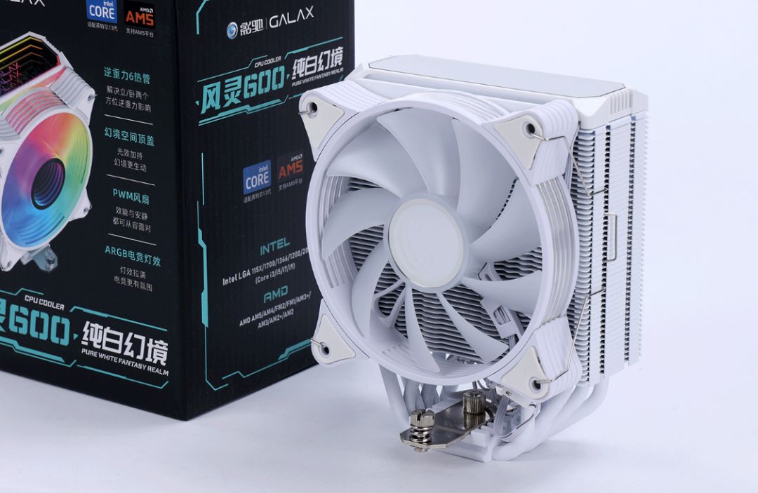 得益于相对充沛的大空间,散热方面,咱也不用只局限于下压式风冷。最终选择的是单塔的影驰风灵600风冷,不仅可以轻松搞定12/13/14代酷睿i5,还有ARGB灯效给颜值加成。
