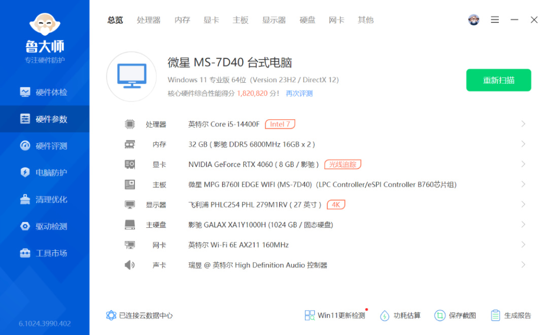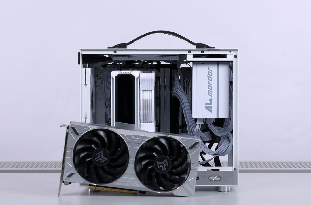 小机箱在显卡选择上限制也相对较多,275mm的安装限长,咱翻遍库存也只找到这款双风扇的RTX4060金属大师OC显卡可以适配。当然,要是段位能再高一到两个级别就更完美了。