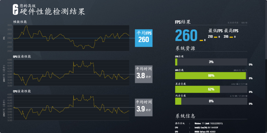 《彩虹六号·围攻》游戏中,画质超高,100%渲染比例,1080P分辨率下,游戏平均帧率为260 FPS