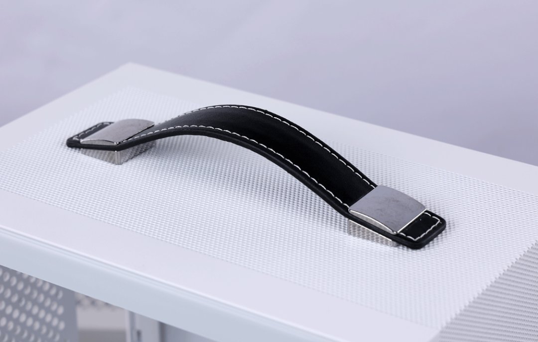 机箱顶部配备了一根高强度皮质提手(内置钢条,两端还有钢制加强结构件固定),可以轻松承载整机重量。