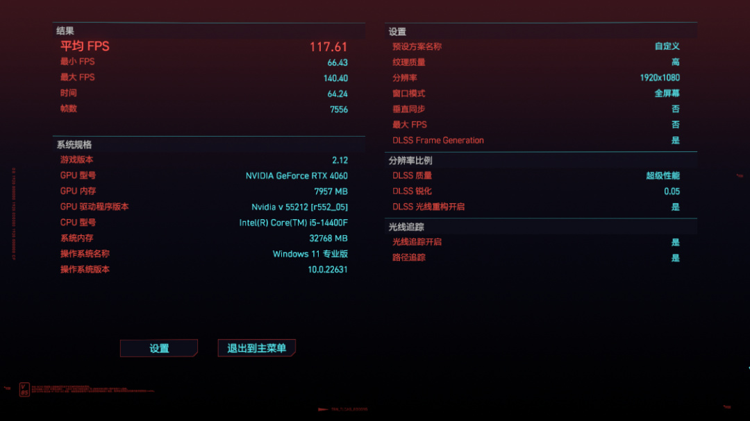 《赛博朋克2077》游戏中,画质超级,光追设为路径追踪模式,DLSS设为超级性能模式,并开启DLSS 3.0与光线重构设置。1080P分辨率下,游戏平均帧率为117.61 FPS;