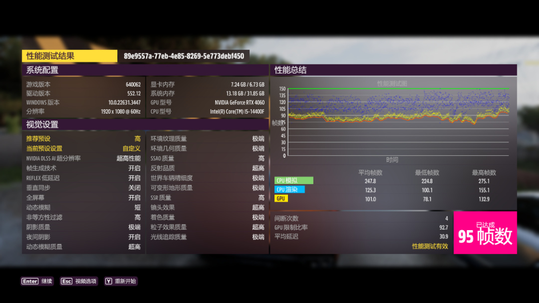 《极限竞速·地平线5》游戏中,极端画质,极端光追,开启DLSS 3.0并设为超级性能模式,1080P分辨率下,游戏平均帧数95 FPS