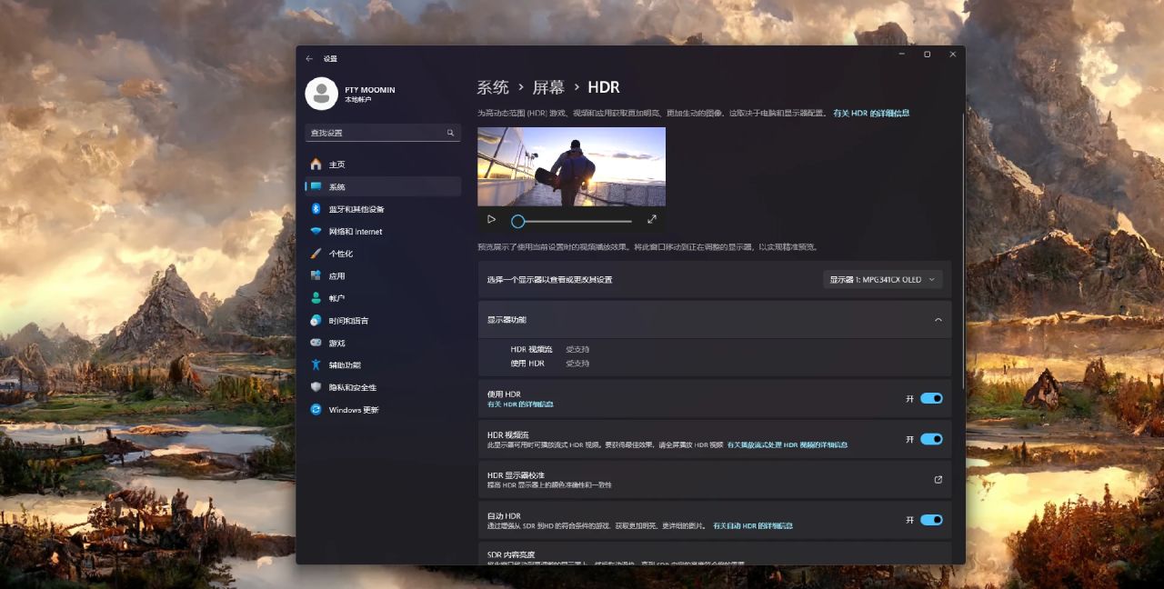 微星MPG 341CQPX QD-OLED開始HDR後,可以看到畫面的對比度大幅增加,高光不在溢出,暗處更暗,飽和度也大幅提升,畫面更加真實。