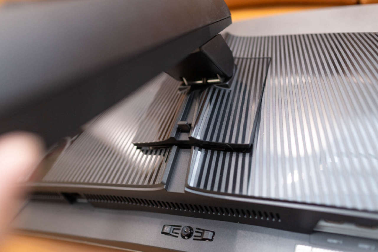 支架和顯示器組合後,顯示器背部的整體性一致。視覺上基本看不到額外縫隙和外露結構。支架卡座底部帶有開拆鎖釦設計,行程較長,安裝到位後可以避免面板意外脫落。