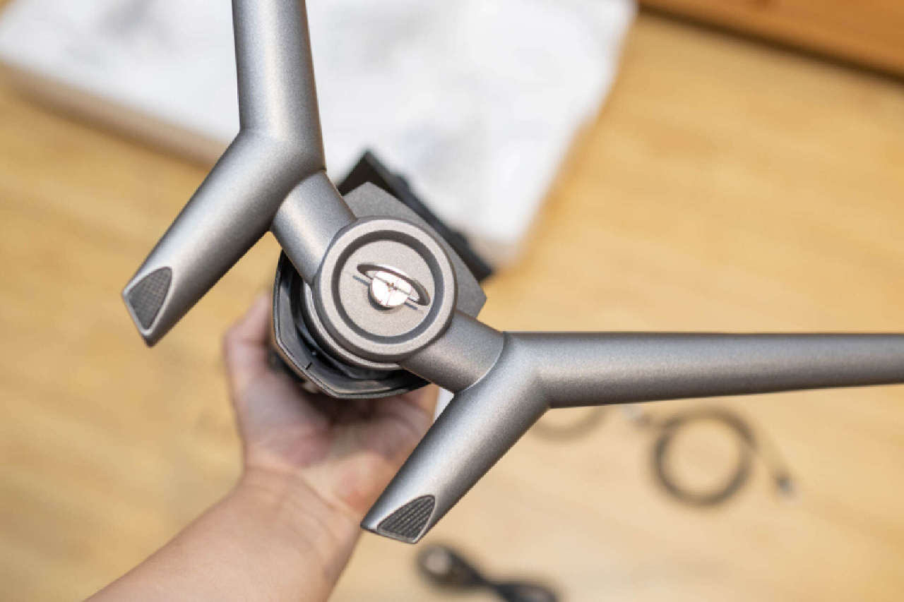 底座用料及其紮實,全鋁合金材質,底部帶有防滑膠墊。底座組合時通過一枚免工具螺絲固定,穩定性和支撐非常可靠。
