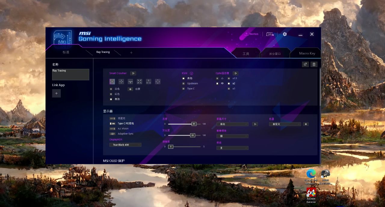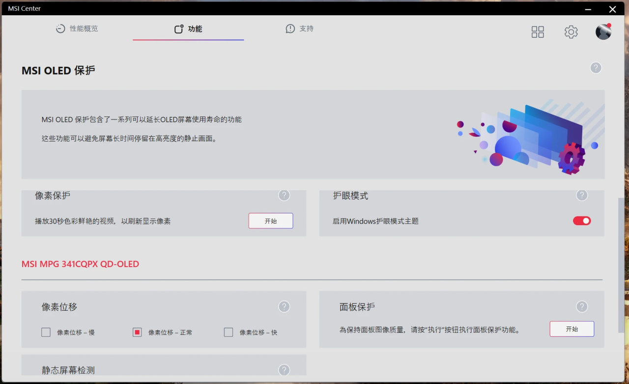 插上USB上傳數據線後,顯示器可以聯入MSI CENTER,合理使用OLED CARE 2.0保護技術,可以大大降低OLED 面板烙印的風險。目前MSI CENTER中就提供了像素位移,面板保護,靜態屏幕檢測,多重圖標檢測,任務欄檢測,便捷檢測等項目,並且都設置多檔調節,可以根據實際使用需要來進行微調。