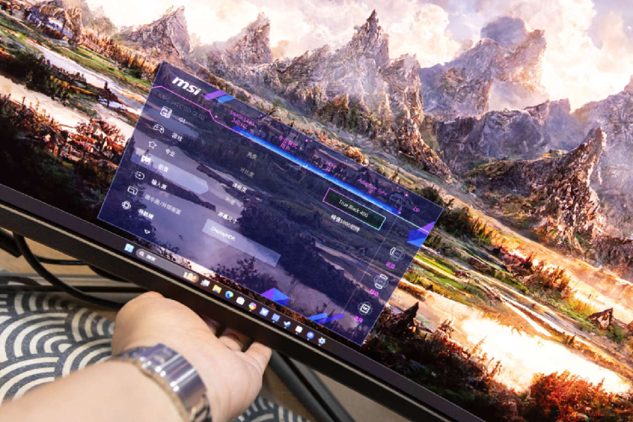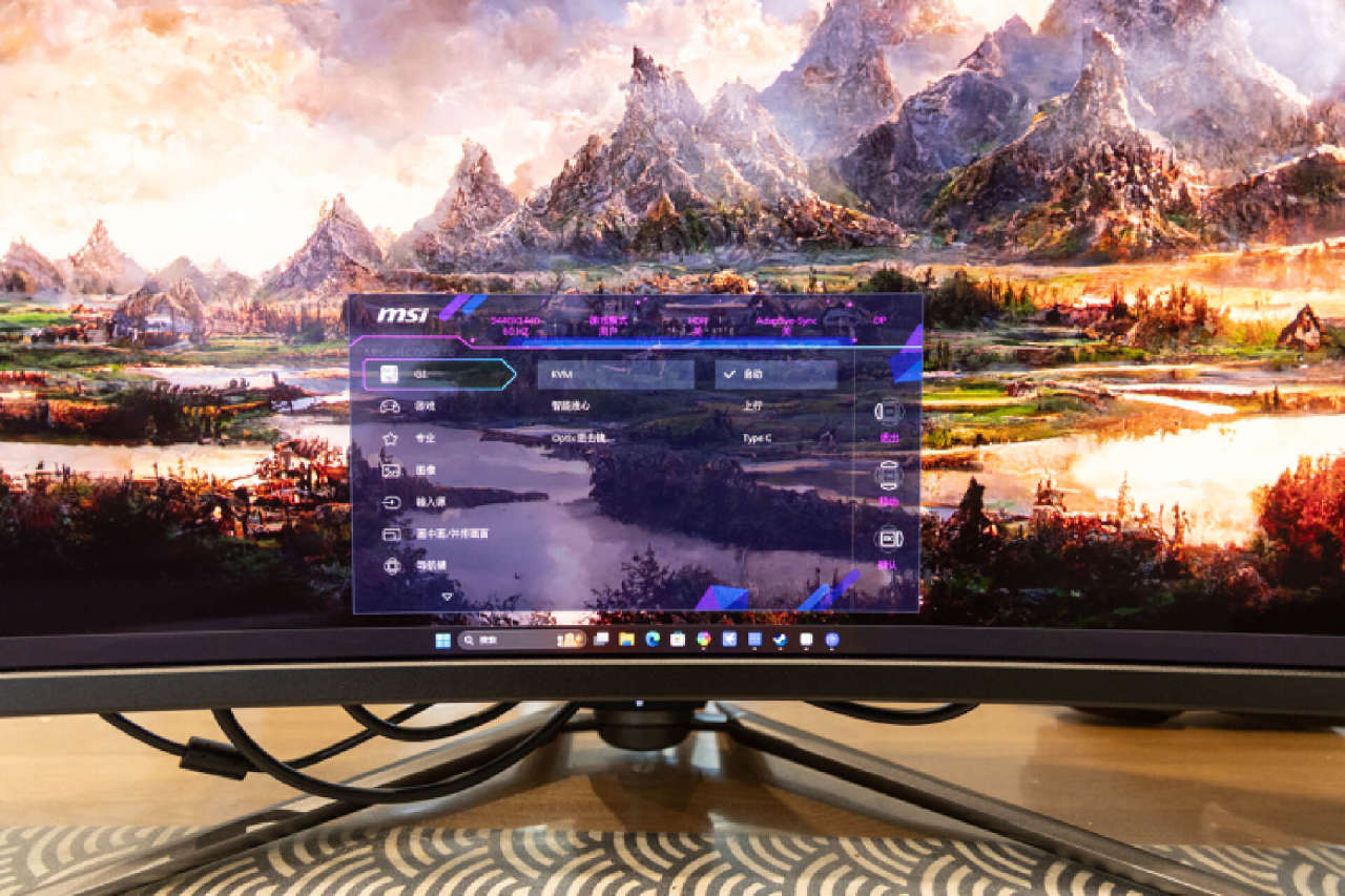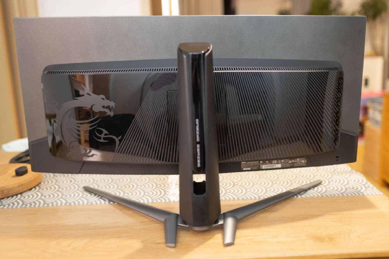 這是顯示器組裝後的最終狀態,支架上的走線孔,可以讓玩家更加方便的理線。在機身的右側可以看到MSI標識和34 QDOLED字樣,識別度和視覺表現也是相當不俗。