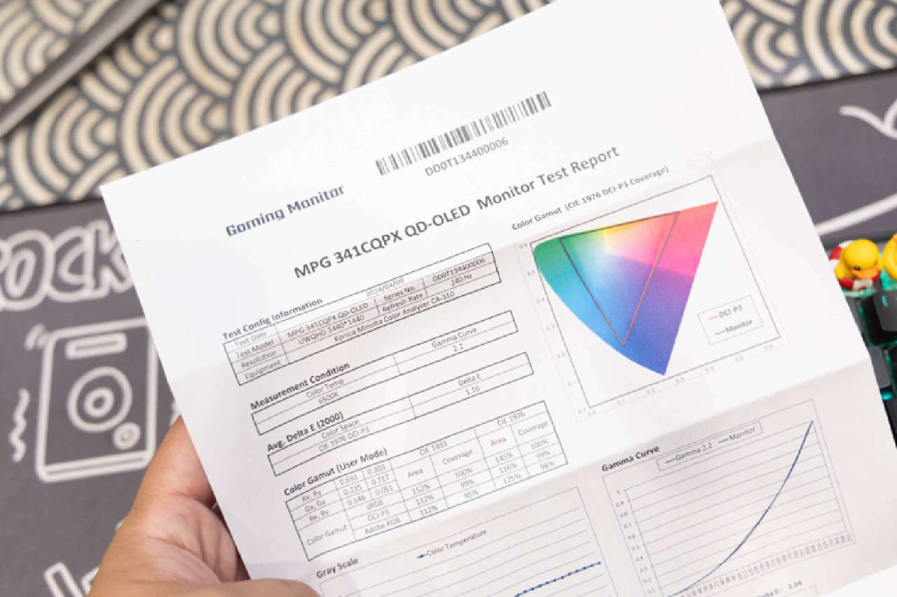 開箱過程有驚喜,在拆開包裝封條後,在包裝箱內側可以找到一份官方的校色檢測報告。每一臺微星MPG 341CQPX QD-OLED都嚴格進行出廠校色,這份報告上還能看到對應的機身序列號,保證溯源。