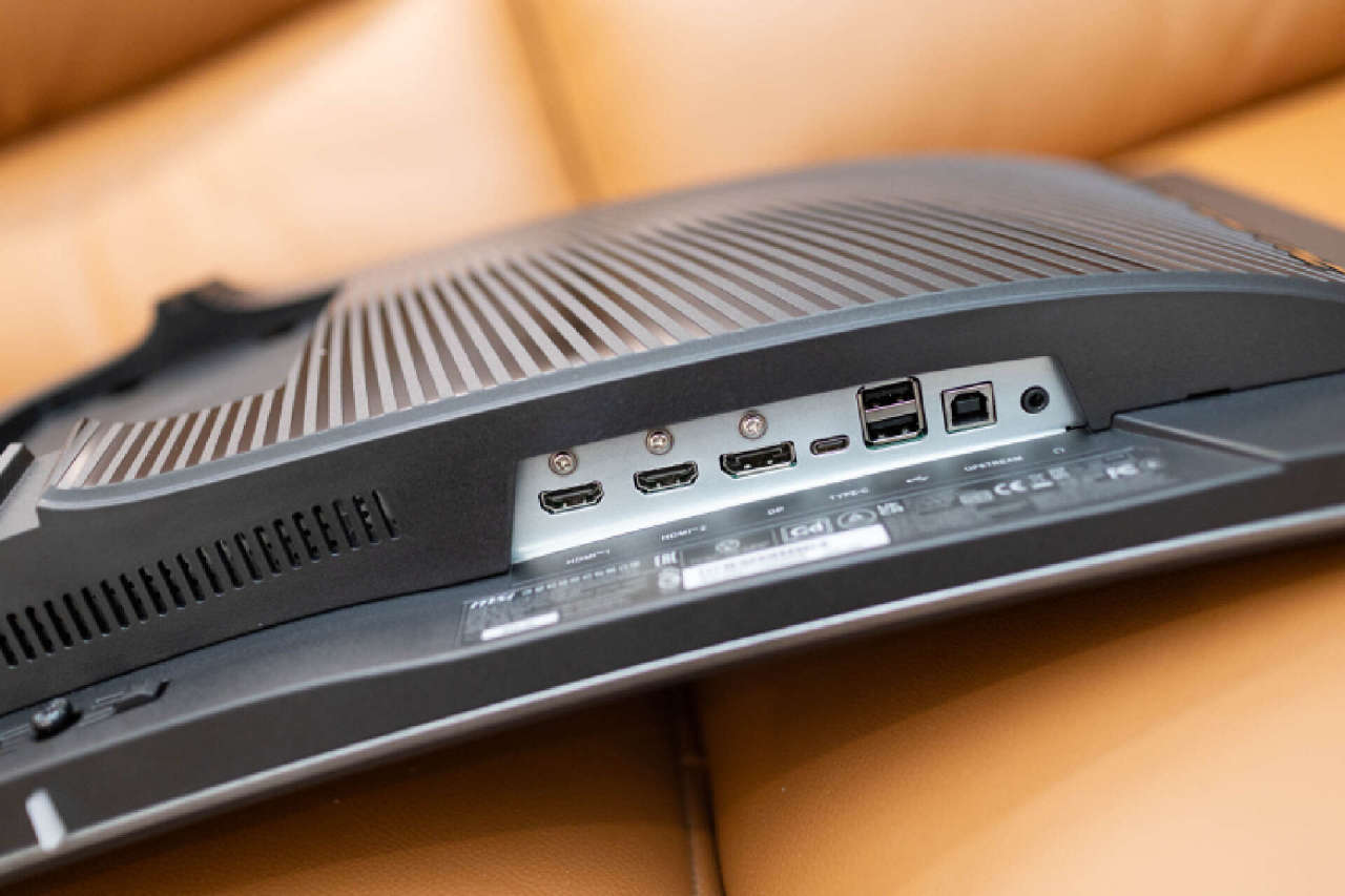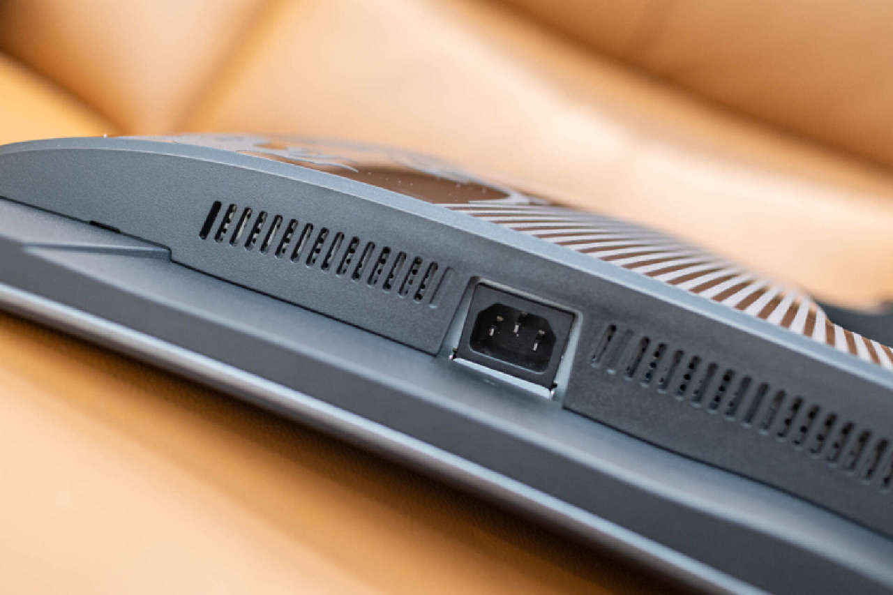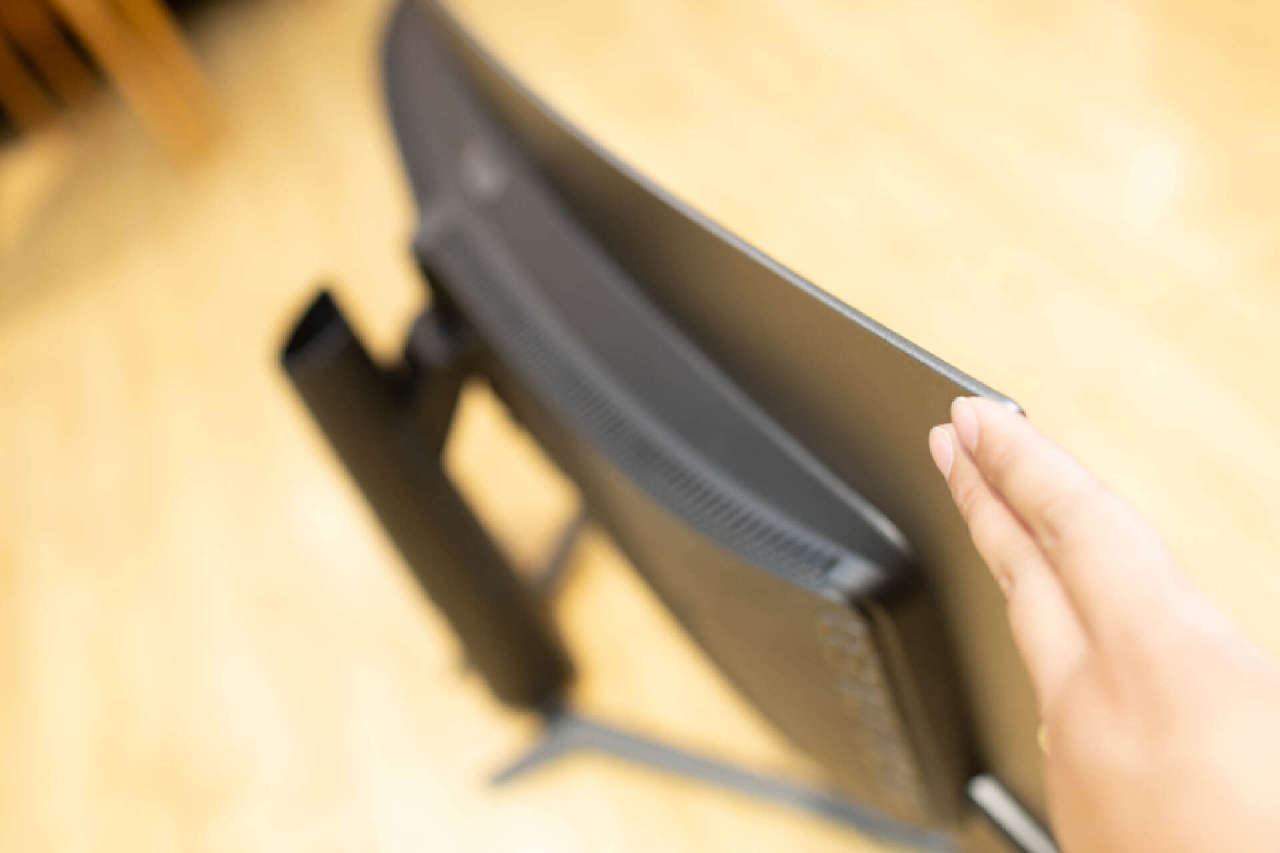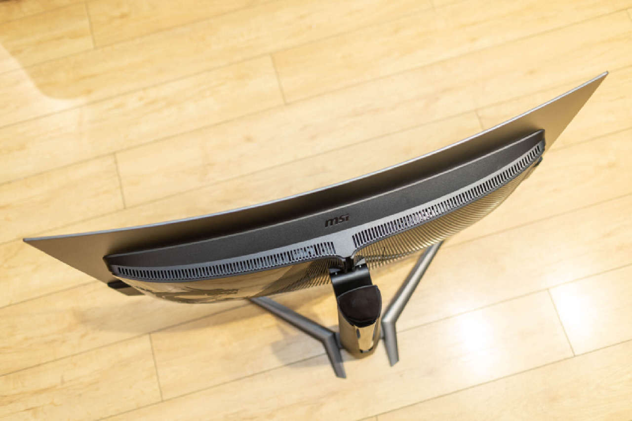 從顯示器頂部看,1800R曲面屏的弧度提供的包圍感還是相當可觀的。機身內置定製石墨烯散熱片,遠看就如同揹着一個機甲揹包。在揹包的頂部和底部均設置了大面積散熱柵格,不僅無需風扇也能保證顯示器長時間正常運行,新型散熱材料還能進一步保證面板的使用壽命。