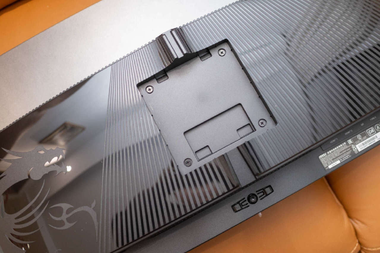 顯示屏背面採用了對稱式的設計,兩側亮面材質,中間部分採用立體鐳射條紋修飾,質感極其出色。顯示器背面中間提供了支架快拆基座,並隱藏VESA 100*100規格接口,原裝配套螺絲已經預安裝,可以輕鬆適配第三方支架。