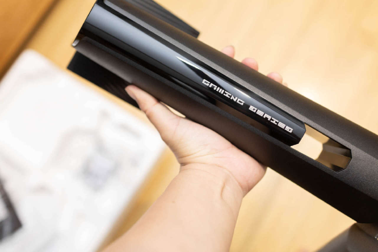 支架臂的外形立體,背部增加了高光面板提升質感,並可以看到GAMING SERING電競標識和預留的理線孔位。