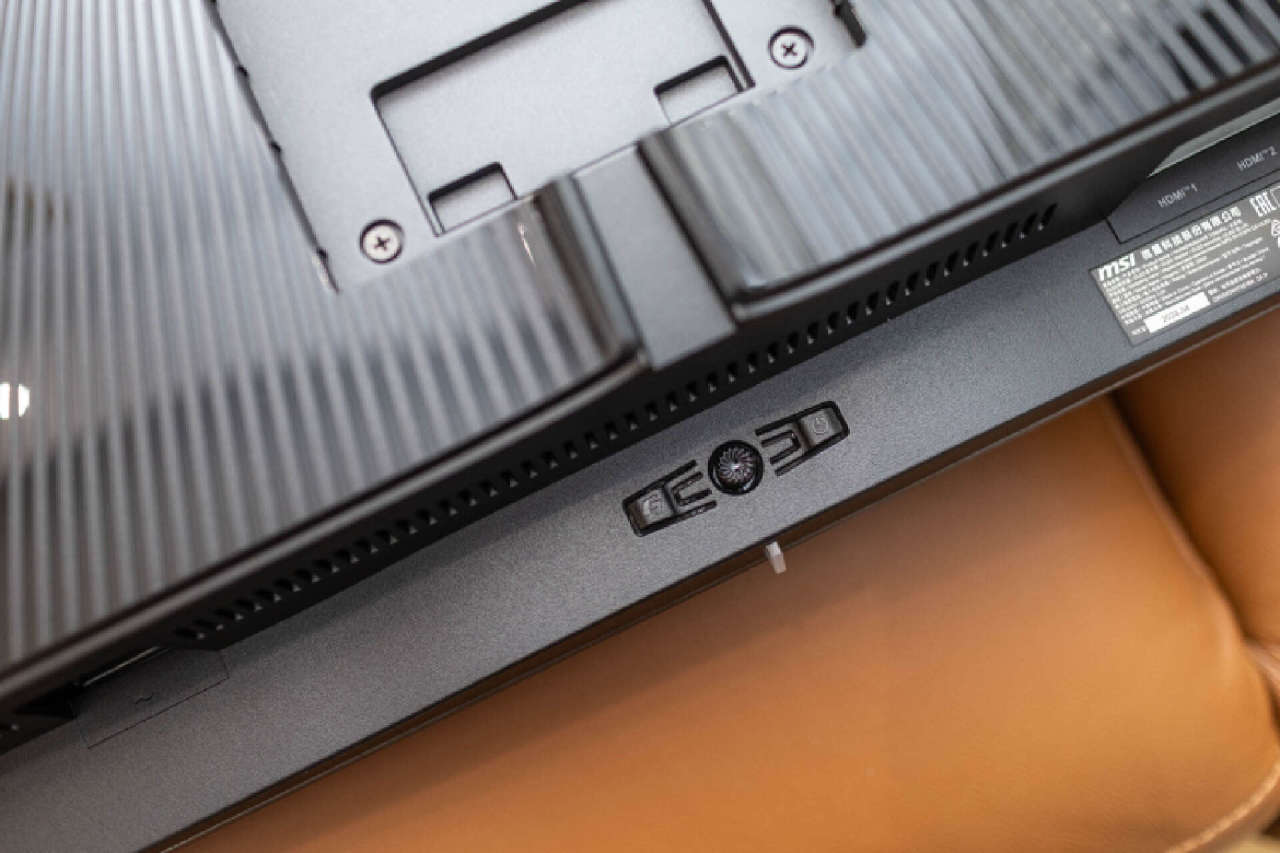 微星MPG 341CQPX QD-OLED的控制模塊位於顯示器背部的正下方,包含了2個實體按鍵和1個多維操控杆,搖桿增加了螺紋處理,可以提供優秀的操控手感和準確的反饋。