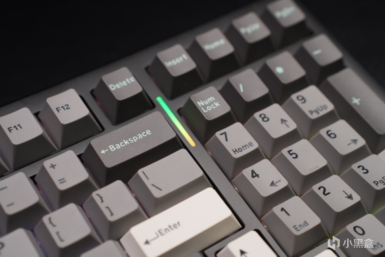键盘字母区和数字区中间做了一个指示灯的设计,他平时就是一个氛围灯,但是在你切换模式以及链接电脑的时候,可以他就变成了连接指示灯。
