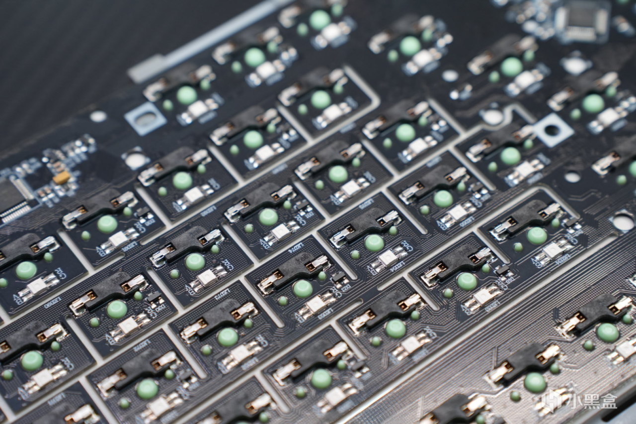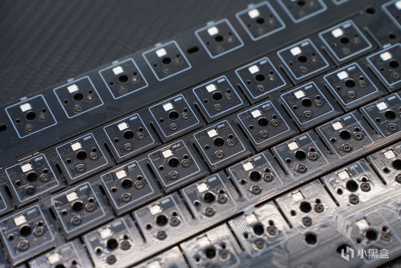 pcb这里采用的是一个单键开槽的设计,上灯位的设计我还是很喜欢的,背面呢采用的是凯华的轴座,同时键盘采用了一个单键开槽的设计,让键盘的手感更加的舒服。