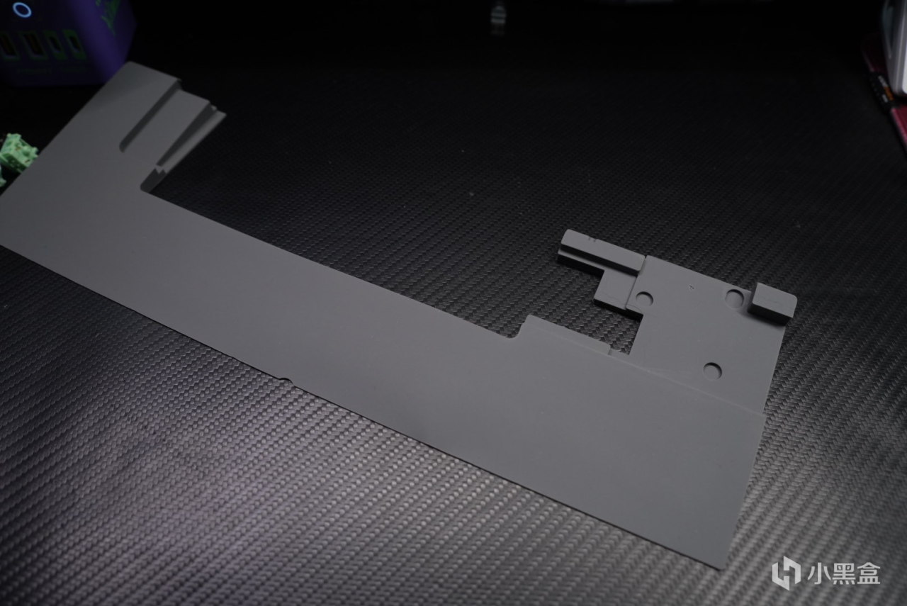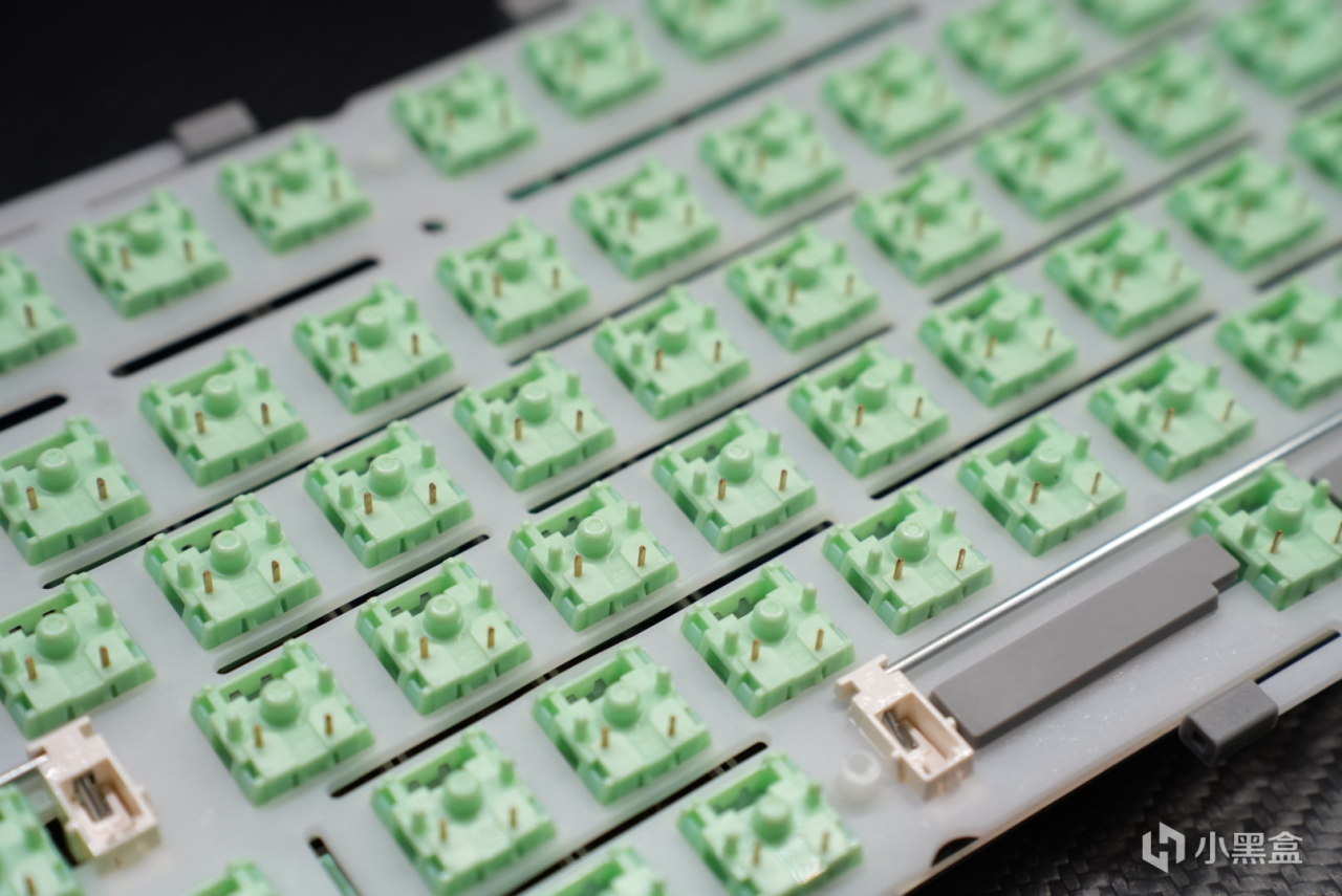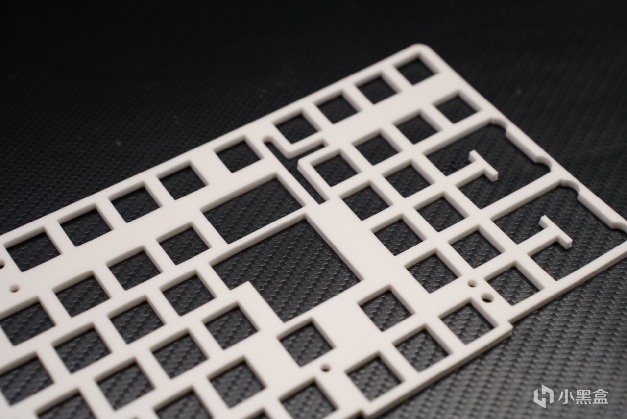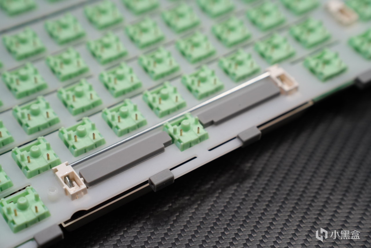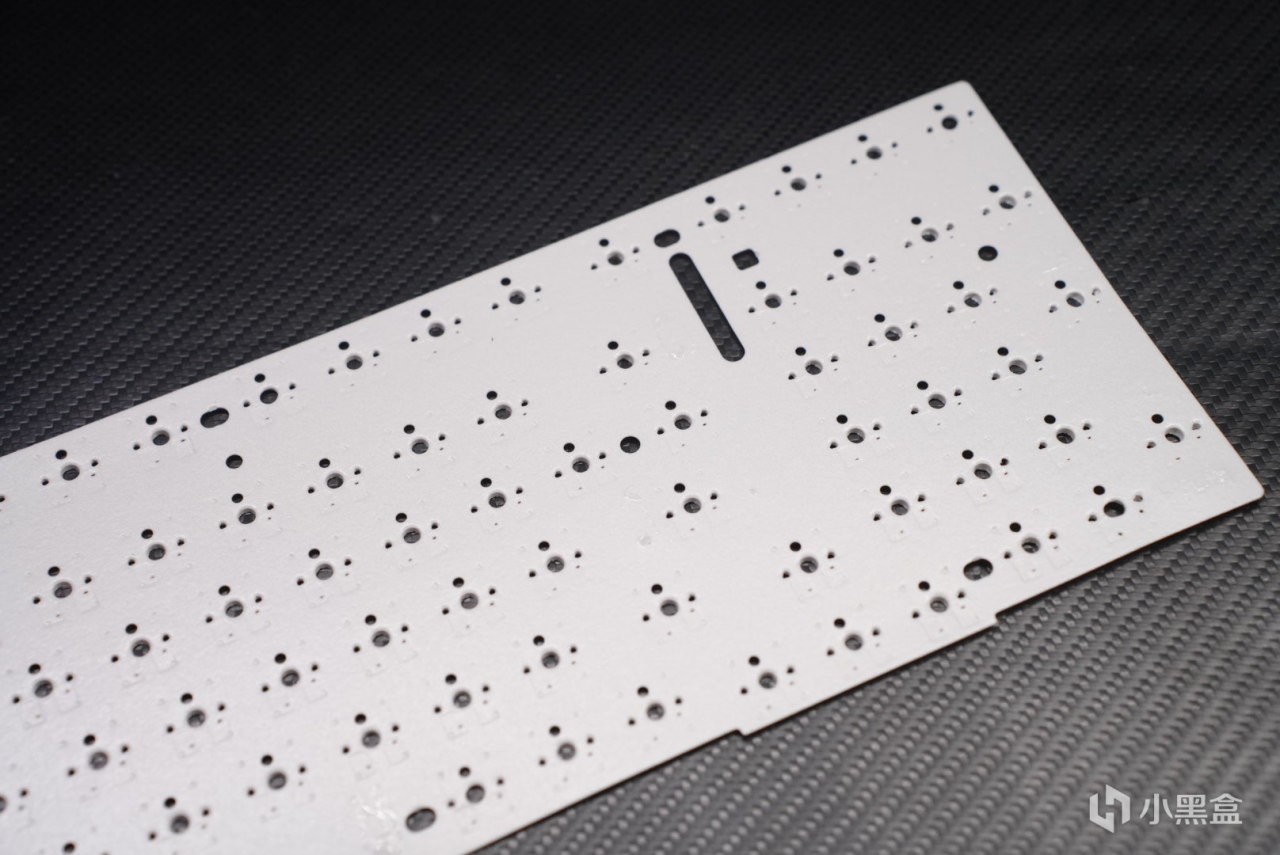 定位板采用了一个横向开槽的定位板设计,开槽定位板可以让gas结构的键盘变得更加的软弹,对于喜欢软弹的用户来说是福音