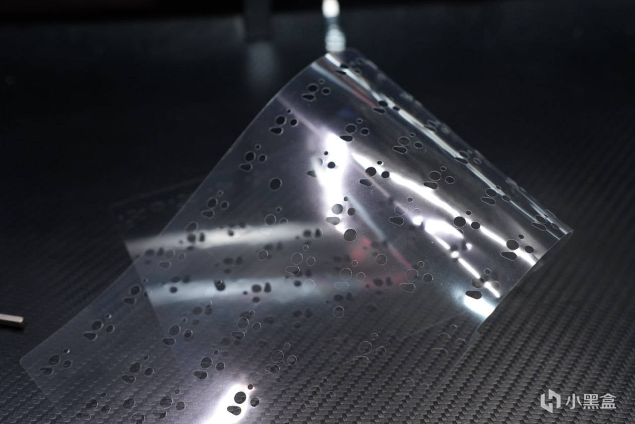 轴下垫之部分,对其卫星轴也有单独的开槽,这里是不错的,材质是一个ixpe材质的轴下垫,轴下垫的主要作用就是让轴体底部与pcb之间的空隙减小,进一步消除空腔音,以及起到一个优化声音的作用。