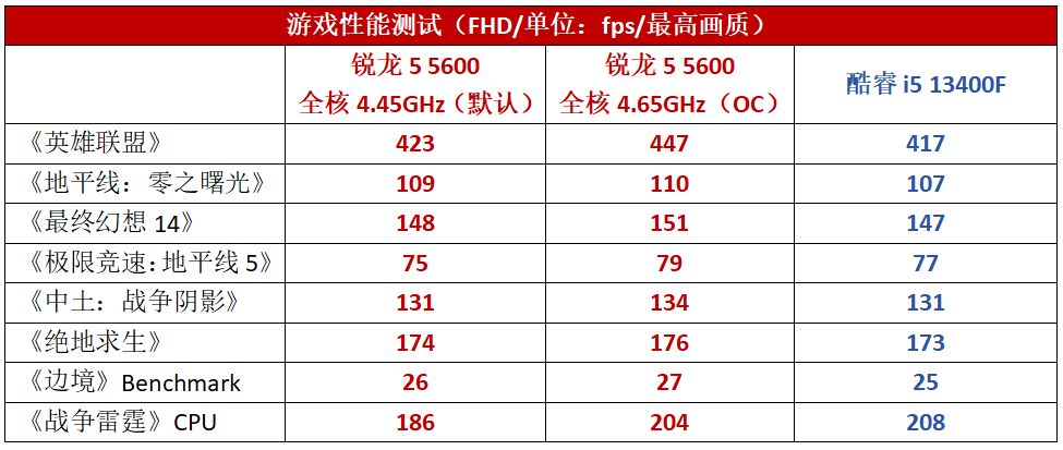 在默认频率下,8款主流游戏测试中锐龙5 5600有5款游戏胜出,1款打平,综合表现已经好于酷睿i5 13400F。要是超频之后,此时锐龙5 5600游戏帧率进一步提升,在7款游戏中实现了领先,优势非常明显。