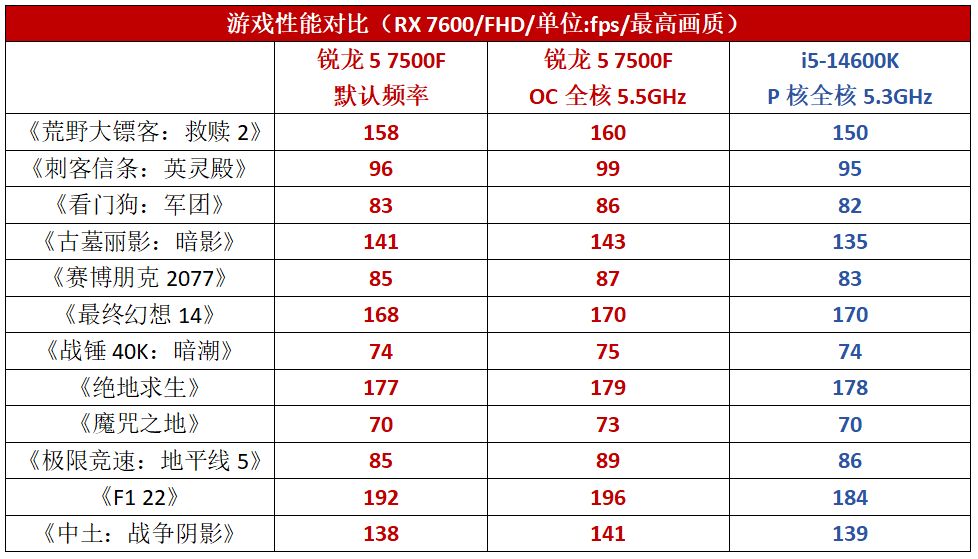在测试的12款游戏中,锐龙5 7500F除了《极限竞速:地平线5》和《中土:战争阴影》两款游戏以1fps告负之外,其余10款游戏7款领先3款战平,平均领先幅度为1%,也算是综合小胜。在全核5.5GHz的频率下,锐龙5 7500F在所有游戏中的成绩均实现了领先,综合领先幅度为3%,性能差距进一步拉大。