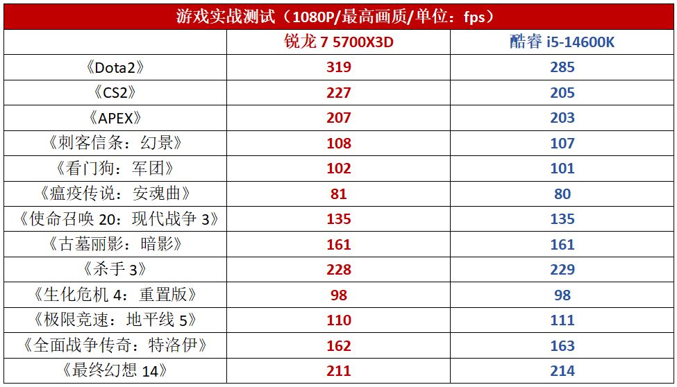 在13款测试游戏中,锐龙7 5700X3D凭借超大的三级缓存容量综合表现胜过了最高加速频率超过5GHz的i5-14600K,特别是《DOTA2》和《CS2》两款电竞游戏,优势特别明显。就只从游戏性能来讲,游戏装机选择锐龙7 5700X3D是更好的选择。